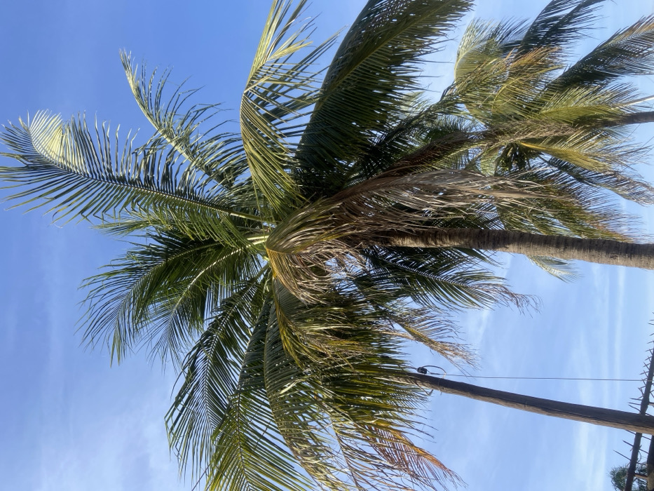 The scene depicts an outdoor environment in Sabon Tasha, Nigeria, under a clear blue sky with scattered wispy white clouds. Multiple palm trees dominate the frame, exhibiting trunks with ringed textures and fronds ranging from vibrant green to dried, brown-tinged foliage. On the far left, a slender, dark-colored wooden utility pole extends vertically, featuring a black coiled cable or object attached near its upper section. A partial, dark-colored structural element, possibly a fence or part of a roof with pointed protrusions, is visible at the extreme bottom left. No human subjects, animals, or active events are present within the captured image.