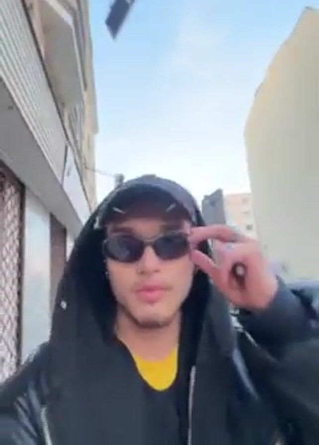 A young man wearing a black hooded jacket, a yellow t-shirt, a black cap with silver accents, and sunglasses walks down a city street, holding and smoking what appears to be a small electronic cigarette