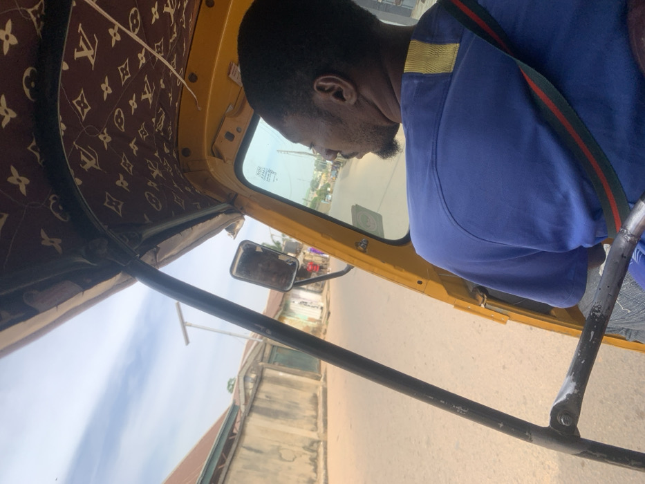 The image presents a view from the interior of a yellow auto-rickshaw, facing forward on a street in Narayi, Nigeria