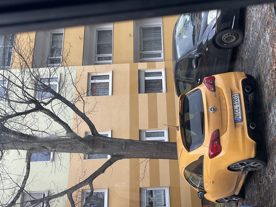 The image depicts an outdoor urban scene in Nuremberg, Germany, identified by the "N CL 1201" license plate. The perspective suggests a slightly elevated or angled view, possibly from within a vehicle or building, with a dark vertical obstruction framing the right side. In the foreground, two parked cars occupy a paved surface composed of dark, irregular cobblestones scattered with light brown debris, possibly dry leaves. The primary subject is a mustard yellow, two-door Opel Corsa hatchback (likely an OPC or VXR variant, indicated by the dual exhaust and body kit), parked with its rear facing the viewer. It features a rear spoiler, a shark-fin antenna, and multi-spoke alloy wheels. To its right and slightly behind, a dark-colored four-door Ford Focus (Mk1) hatchback is partially visible, showing its front-right side and a steel wheel. Dominating the midground is a mature, leafless deciduous tree with a thick trunk and intricate bare branches, indicating late autumn or winter. The tree partially obscures the background. The background features a multi-story residential building with a distinctive horizontally banded facade. The upper section is light cream/pale yellow, followed by a mustard yellow band, then another light cream section, and a final mustard yellow band at the bottom. The building is fitted with numerous white-framed rectangular windows. Some windows display internal white curtains or blinds, while others on the lower levels show partially open external roller shutters. On the far right, a vertical stack of balconies with transparent railings is visible. The sky is overcast, casting a soft, diffused light on the scene. No individuals are visible.