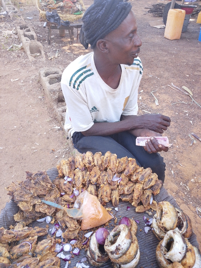 A man with dreadlocks sits with a wad of cash in hand, displaying various fried foods on a round, wooden surface. A pile of small fried bananas sits beside larger fried fish pieces, both sprinkled with red onions. A clear plastic bag with a light orange sauce rests on top of the fried bananas, a plastic spoon partially visible. The food stall is in a rural area with a dirt ground.