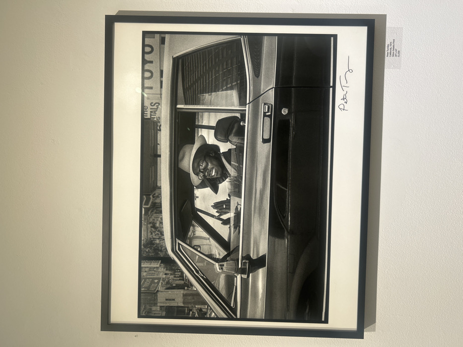 A framed black and white photograph hangs on a neutral wall. The photo features a man wearing a hat and glasses, leaning out of a car window. The car's door is visible, and a sign with "TOYOTA RENTALS" can be seen in the background through the window. The artist's signature is on the lower right of the white border. A small tag with information and price is affixed to the wall near the upper right corner of the framed photo.