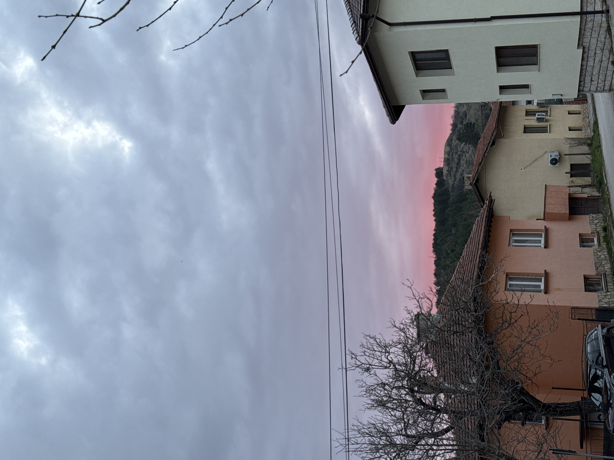 The image captures a street scene in Yablanitsa, Bulgaria, under a cloudy, overcast sky transitioning to a pinkish hue near the horizon. In the foreground, utility wires stretch across the sky, and bare tree branches are visible. On the right side of the frame, residential buildings are positioned, showcasing a mix of architectural styles. The houses are painted in varying colors, including beige, peach, and white. A mountainous landscape covered with trees rises in the background. A car parked near the buildings.