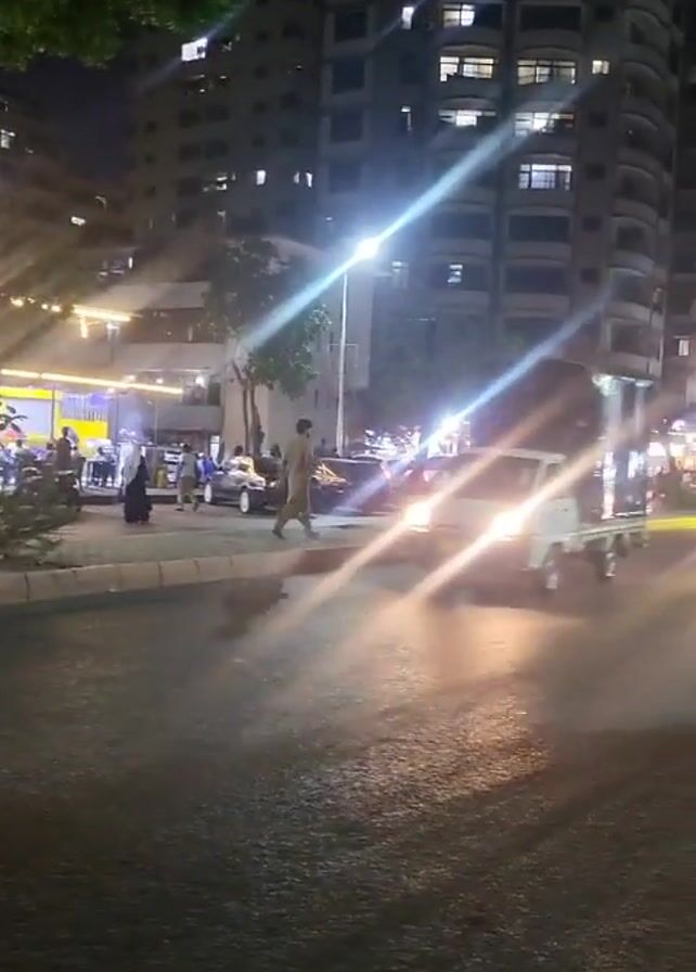 street scene at night with a large building in the background. The building has many lit windows. There are streetlights providing illumination. People are walking along the sidewalk and crossing the street. Cars and motorcycles are moving along the road. The video's focus is initially obstructed by what appears to be a person's head before becoming clearer.