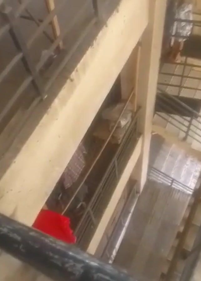 view looking straight down into a multi-story stairwell of a building. The stairwell is narrow and rectangular, with stairs visible in the right side of the frame. The camera is likely positioned on an upper floor, looking down through the metal railing. A red garment is visible draped over the edge of the railing closest to the camera. The walls are painted in light colors. The overall lighting is dim.
