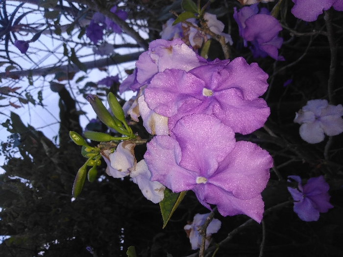 The image displays a close-up of a flowering plant, observed in the city of Kladné, Czechia. The central focus is on a cluster of trumpet-shaped flowers and developing buds. Two prominent flowers in the foreground are a vibrant purple with pale, almost white, centers, and their petals are covered in numerous small, reflective droplets. Surrounding these are several flowers in various stages of bloom or senescence, some appearing white or faded purple. Multiple elongated, green flower buds are visible at the top of the frame, interspersed with dark stems and sparse green foliage. The background is heavily blurred and dark, consisting of dense foliage and branches, with a small patch of muted, overcast sky visible in the upper right. No individuals, animals, or man-made structures are discernible within the frame. The scene is illuminated by dim, ambient light.