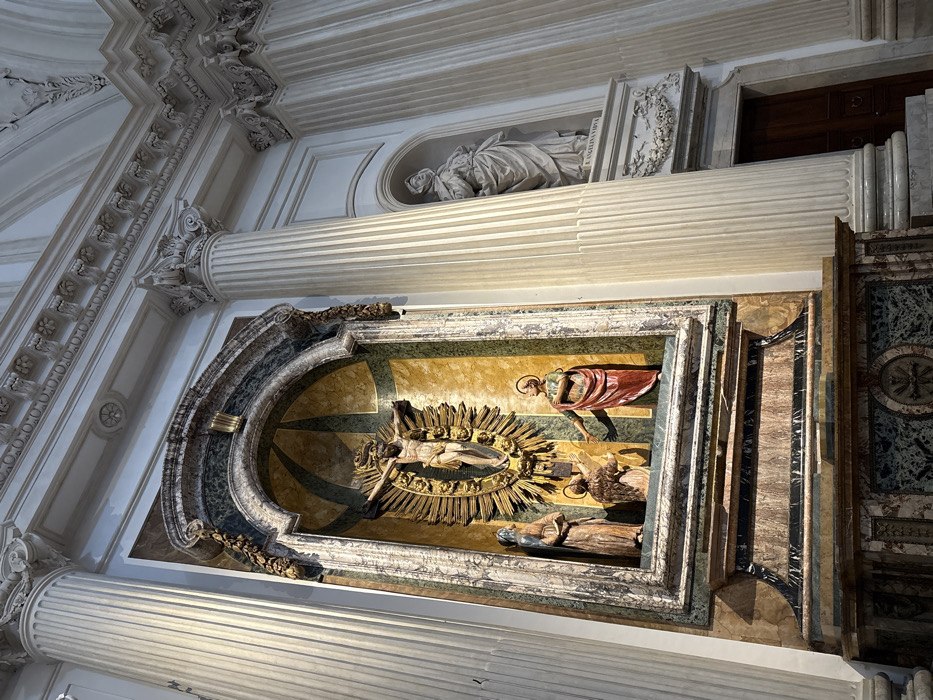 The image displays the richly decorated interior of the Cathedral of San Feliciano (Duomo di Foligno) in Foligno, Italy. The central focus is an ornate, arched altarpiece set against a light-colored wall, flanked by two tall, fluted Corinthian columns of cream or white stone. The altarpiece features a deep niche containing a carved relief or sculpture of the Crucifixion. Jesus is depicted on the cross, made of a dark material, against a background of radiating golden sunburst rays. At the base of the cross, three figures are positioned: a standing female figure in a light brown robe on the left, a kneeling figure in a brown robe directly below the cross, and a standing male figure in a red tunic and light blue cloak with a raised hand on the right. The niche is framed by dark green, black, and white veined marble, with gold-colored leaf ornamentation along the arch. The background behind the figures within the niche is a lighter, patterned marble or fresco in yellow and green tones. Below the niche, a substantial altar structure made of multi-colored veined marble (brown, black, green) features a central circular medallion. To the right of the main altarpiece, a smaller arched niche houses a white marble statue of a standing robed female figure, possibly a saint, on a rectangular pedestal. A faint inscription, possibly "B. ANGELINA VIVA," is visible on the pedestal. Below and slightly to the right of this statue, a dark wooden door with a rounded arch is partially visible. Above the columns and altarpiece, an elaborate white entablature, adorned with classical moldings, rosettes, and dentils, extends horizontally. The ceiling, partially visible at the top-right, is vaulted and intricately decorated with white stucco relief work. The scene is illuminated by ambient light, creating subtle shadows that highlight the architectural details and sculptures. No living individuals are present in the image.