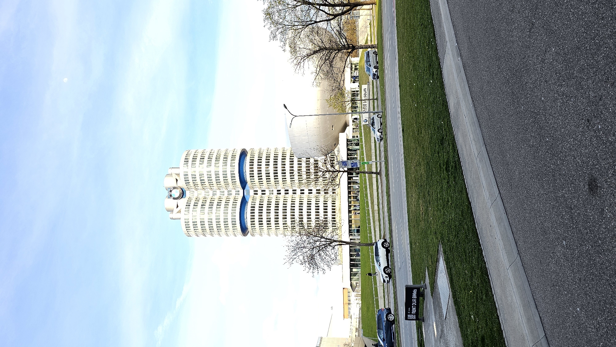The image presents a daytime scene in Munich, Germany, featuring the BMW Welt and BMW Museum. These buildings are iconic structures, with the BMW Welt characterized by its modern, bulbous architecture and the BMW Museum recognizable by its distinctive four-cylinder design. The environment consists of a partly cloudy blue sky. The view appears to be from street level, showcasing adjacent grassy areas, pedestrian walkways, and roadways where vehicles, including BMWs, are parked or moving. Street signs and advertisements, such as "RENT OUR BMWS", are visible.