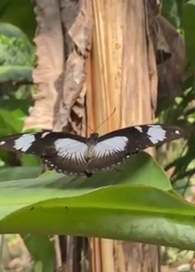 black and white butterfly resting on a large green leaf. The leaf is positioned in front of a brown tree trunk and is surrounded by other green plants. The butterfly's wings are fully extended. It appears to be struggling against the wind, as its wings are slightly agitated. A voice mentions that the butterfly is navigating against the wind, which is trying to carry it away. The speaker points out that the butterfly doesn't want to fly yet.