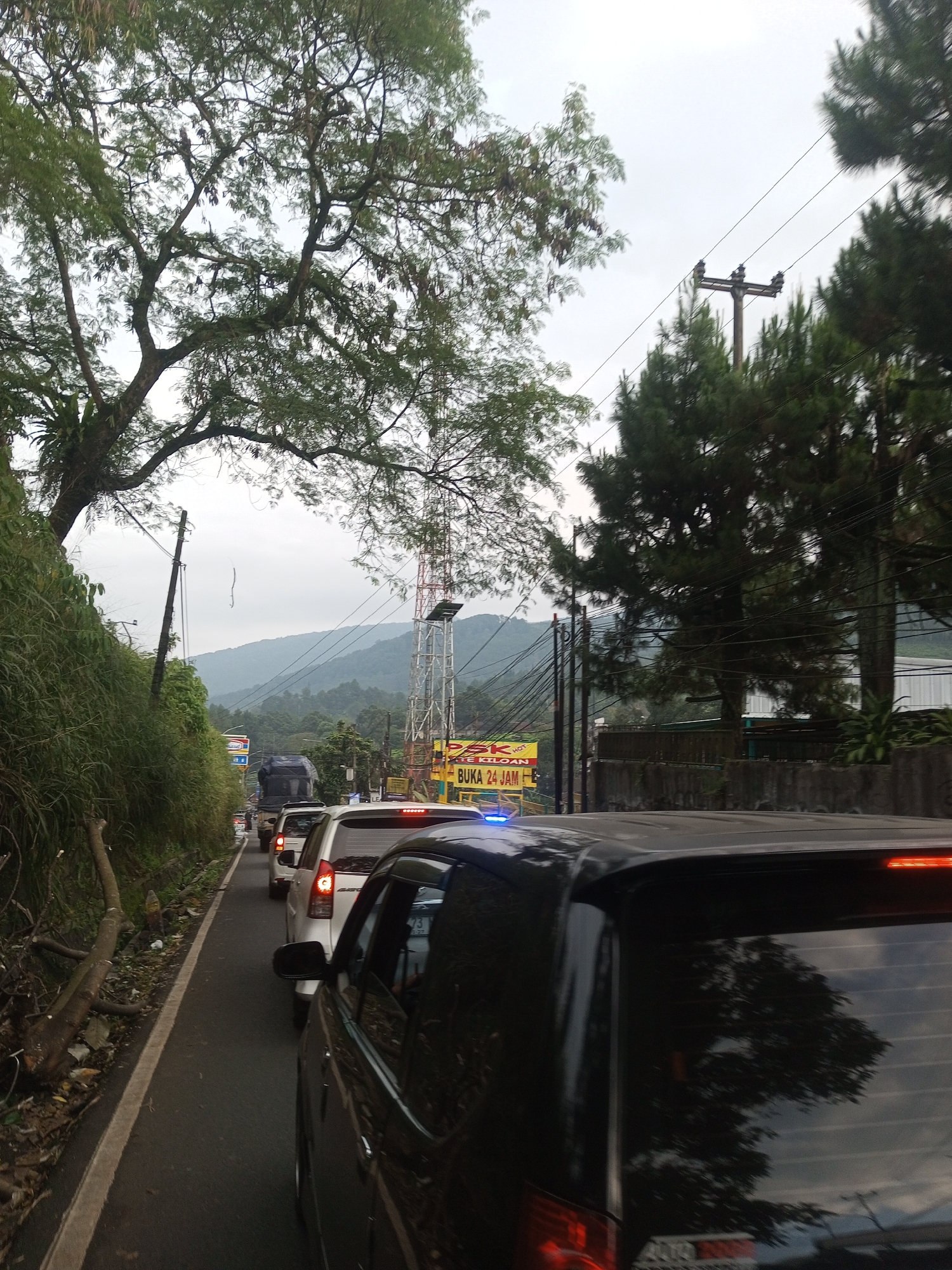 A street in Taunggyi, Myanmar, is congested with cars in a traffic jam. The vehicles are primarily cars, including a black van in the foreground with its brake lights illuminated. On the left is a roadside covered with foliage and a fallen tree limb. A tall telecommunications tower and mountains are visible in the background under a cloudy sky. An overhead power line follows the street. A sign with yellow lettering that reads "BUKA 24 JAM" is also visible in the background.