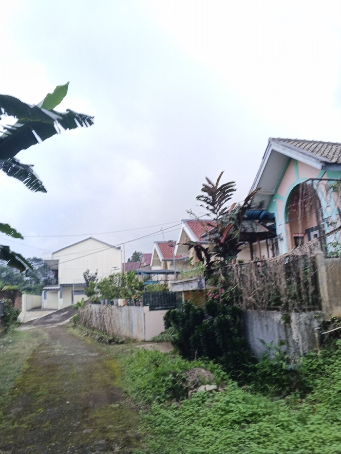 The image displays a residential street in Ream Quarter, Cambodia, under an overcast sky. A moss-covered concrete pathway occupies the foreground, ascending towards the left. Dense green undergrowth lines the immediate right of the path, leading to a concrete retaining wall. In the midground, a house with a light-colored facade accented by pink and turquoise trim, an arched entrance, and a tiled roof is prominently situated on the right. A plant with dark foliage stands directly in front of this residence, which is bordered by a fence partially obscured by dry vegetation. A sequence of houses with reddish-brown tiled roofs and light-colored walls extends into the background on the right. Utility lines are visible crossing the upper portion of the frame. To the left, further along the path, a larger, light-colored two-story building with a flat or low-pitched roof is present. Distant trees are visible in the far background. No individuals or discernible activities are depicted.