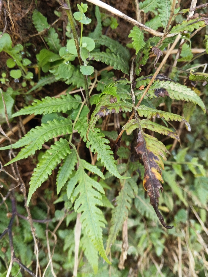 A close-up image reveals a patch of ferns thriving among other greenery. The ferns showcase a vibrant green hue on most leaves, while others exhibit shades of brown and yellow, hinting at maturity or perhaps slight decay. Thin, brown stems weave among the foliage, adding texture to the scene. Small, round-leaved plants dot the background, providing a varied landscape of vegetation.