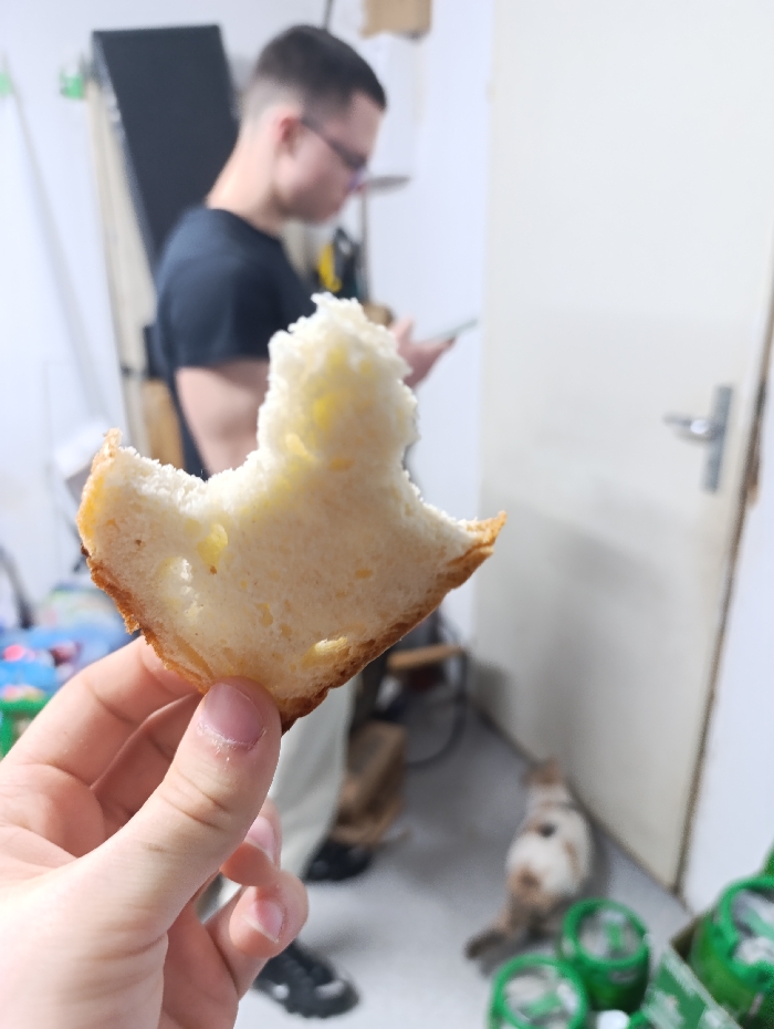 The image depicts an indoor scene in Silistra, Bulgaria. In the foreground, a human hand holds an irregularly torn piece of leavened white bread, exhibiting a golden-brown crust and visible internal air pockets. In the blurred midground, a male individual with short dark hair and glasses, dressed in a black t-shirt and light-colored trousers, stands in profile, facing right. He holds and appears to be observing a light-colored mobile phone in his right hand. To the right, a white interior door with a silver handle is partially visible. On the light-colored floor, near the door and the standing individual's feet, a small, light-colored cat with brown markings is observed, positioned with its back to the viewer. Several green cylindrical containers are partially visible in the lower right foreground. The background consists of a light-colored wall and an indistinct dark structure, possibly equipment.
