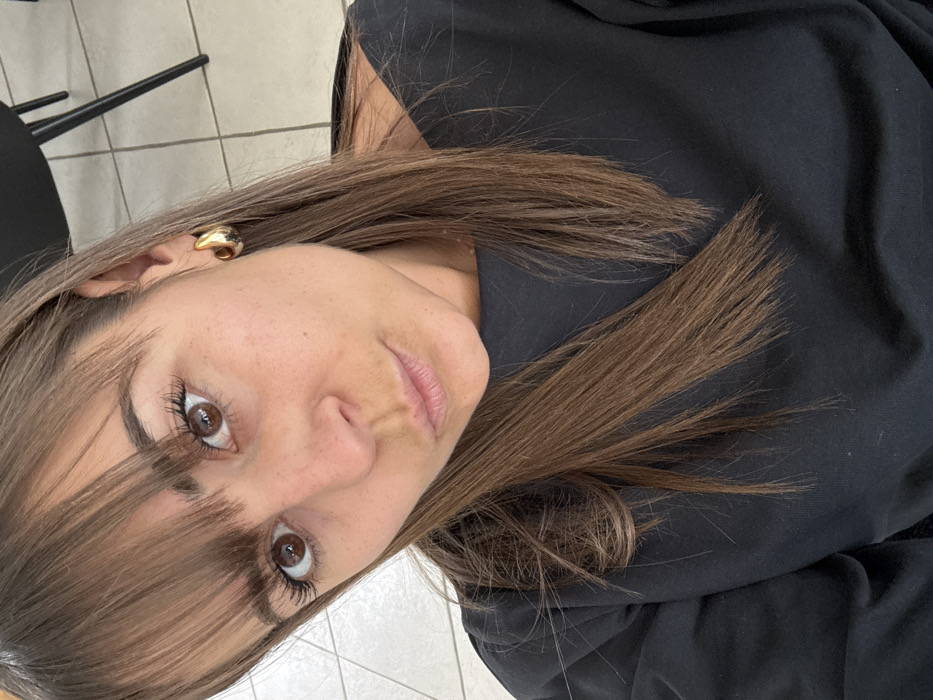 A female subject, appearing to be in an indoor environment in Veauchette, France, is captured in a close-up, head-and-shoulder level shot. She has medium-brown hair with bangs covering her forehead and long, straight hair extending over her shoulders. Her eyes are brown, and she has visible eyelashes. Light freckling is present on her facial skin. Her lips are slightly puckered in a pouting expression. She wears a dark, possibly black, long-sleeved top with a wide, boat-style neckline. A single, C-shaped, thick, gold-toned hoop earring is visible on her right earlobe. The background consists of a light-colored tiled floor with visible grout lines and partial views of dark, slender furniture elements in the upper right.