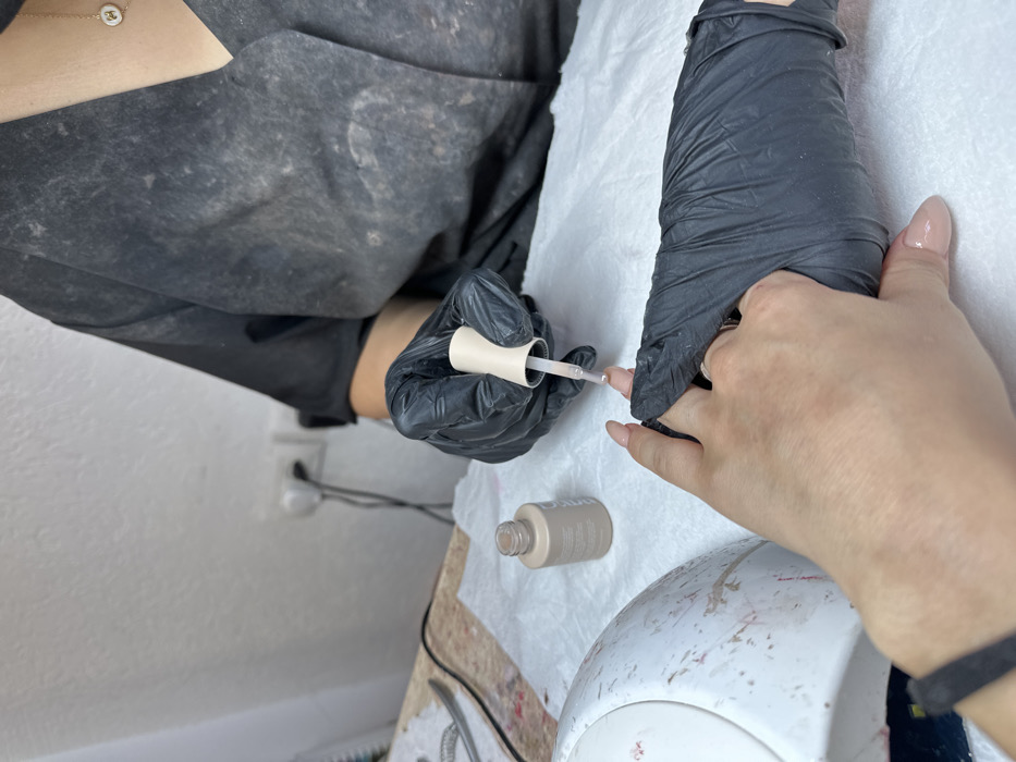 A close-up, high-angle interior image captured in Kafr Kasim, Israel, depicts a manicure in progress