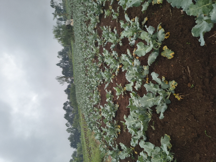 The image displays an extensive agricultural field located in An Khe Ward, Vietnam, under a uniformly overcast, light grey sky. The field is densely planted with rows of young, green leafy crops, consistent with brassica varieties such as broccoli or cabbage, cultivated in dark brown, tilled soil. Individual plants feature broad green leaves, many of which exhibit visible water droplets, and some display areas of yellowish discoloration. The field gradually slopes upwards towards a dense line of various trees forming the horizon in the background. A small, indistinct structure or object is partially discernible near the tree line on the right side of the frame. No individuals are present or engaged in activities within the visible scene.