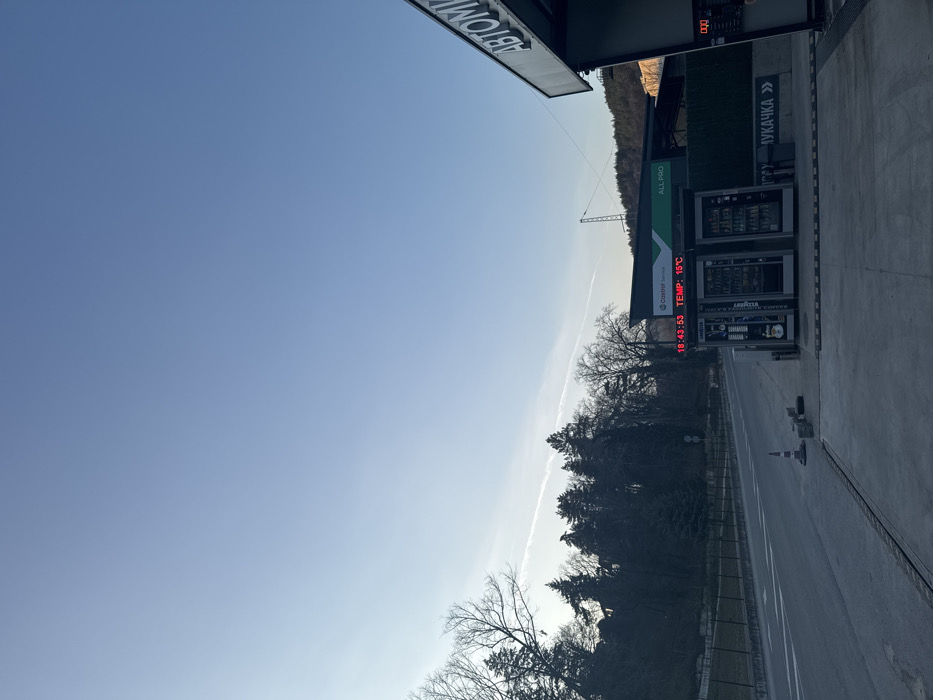 An outdoor scene in Belovo, Bulgaria, captured during late afternoon or early evening under a clear blue sky. The foreground features a concrete paved area adjacent to a two-lane asphalt road that curves uphill to the left. On the right, a dark grey building facade with white Cyrillic lettering "ABTOMИ" (likely "АВТОМИВКА" - car wash) is partially visible. Directly in front of this, a compact structure houses two vending machines: one for Lavazza coffee and another for packaged snacks/drinks. Above these machines, a digital red LED display shows "18:43:53 TEMP: 15°C". A green and white sign, partially obscured, indicates "Castrol Service" and "ALL PRO". Behind the vending machines, a dark fence or wall has the word "ЛУКАЧКА" in white Cyrillic. Near the road's edge on the left, a white and orange traffic cone stands beside several grey concrete blocks. The road is bordered by a low fence, beyond which an embankment leads to a dense line of trees, predominantly bare deciduous, with some evergreens interspersed. In the far background, rolling hills are visible, topped by a metal lattice structure, possibly a transmission tower. No individuals or active vehicles are present in the image.