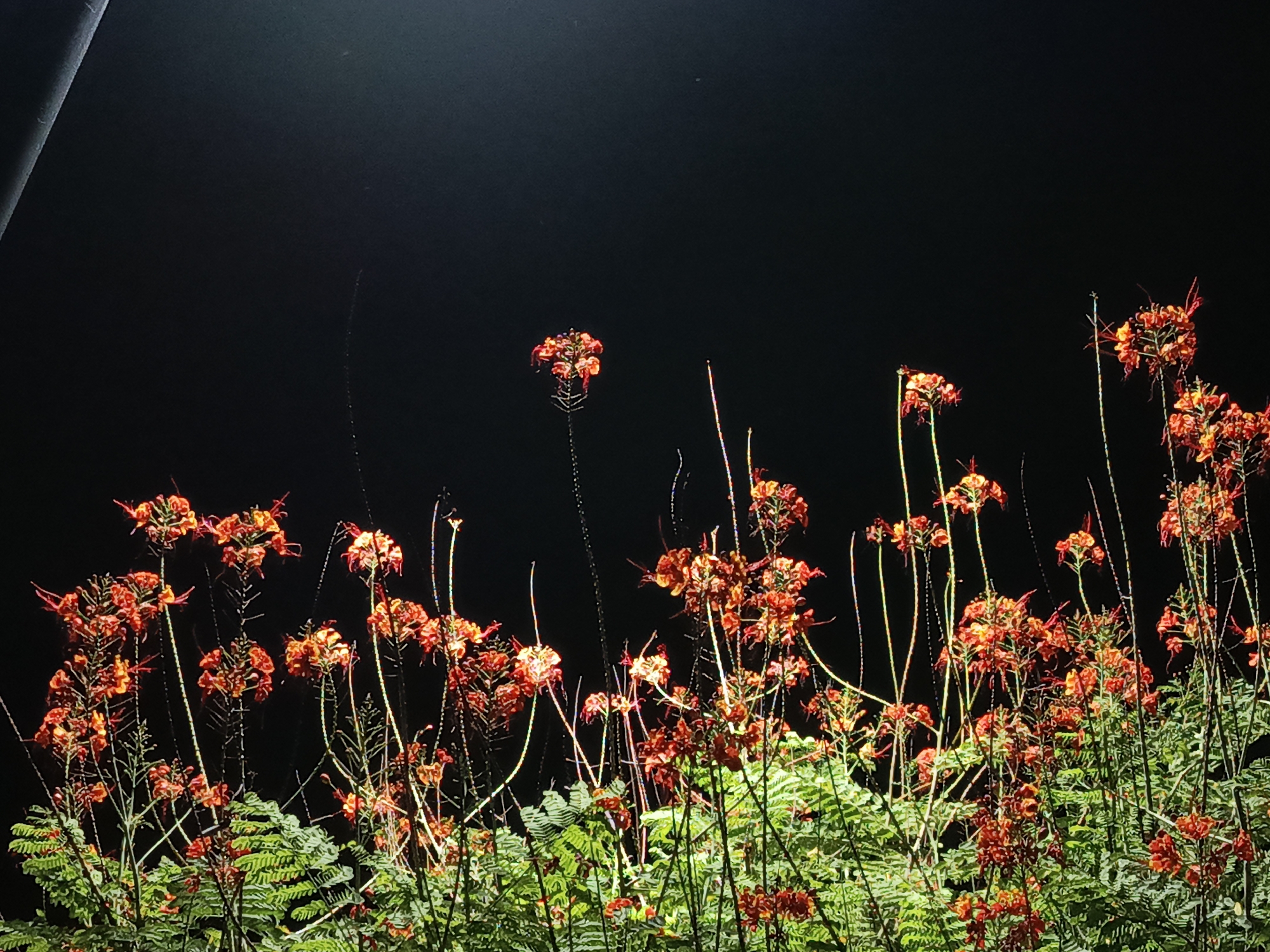 This image depicts a dense cluster of flowering plants, likely *Caesalpinia pulcherrima* (Peacock Flower or Pride-of-Barbados), photographed at night in Tinaco, Venezuela. The plants occupy the lower two-thirds of the frame against a uniformly dark, unlit background representing the night sky. The foliage, visible in the lower portion, consists of numerous small, green, bipinnate leaves, forming a dense, textured base. Emerging from this foliage are multiple slender, elongated stems, some appearing almost translucent or reflective under illumination, topped with vibrant inflorescences. The flowers are predominantly red-orange with yellow accents, characterized by delicate petals and long, prominent red stamens that extend beyond the corolla. These flowers are arranged in racemes, creating numerous individual blooms and clusters across the plant canopy. The scene is illuminated by an artificial light source, casting light directly onto the plants from an elevated position, resulting in bright highlights on the flowers and upper leaves. A dark, diagonal structure, possibly a light pole or part of a fixture, is partially visible in the upper left corner of the frame. There are no individuals, objects, or actions other than the illuminated flora and the implied light source.