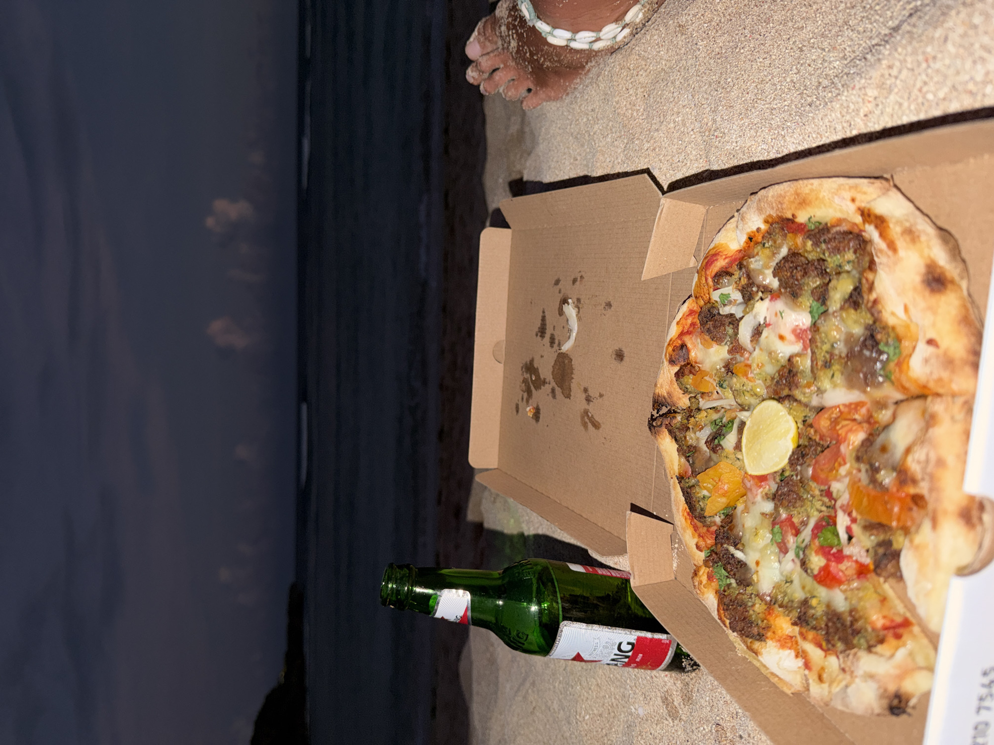 beach scene in Nusa Dua, Indonesia. A pizza in an open cardboard box sits on the sand, next to a green glass beer bottle. A person's foot wearing a beaded anklet is visible in the upper right. The beach stretches into the left, where a dark body of water meets the shore under a twilight sky.