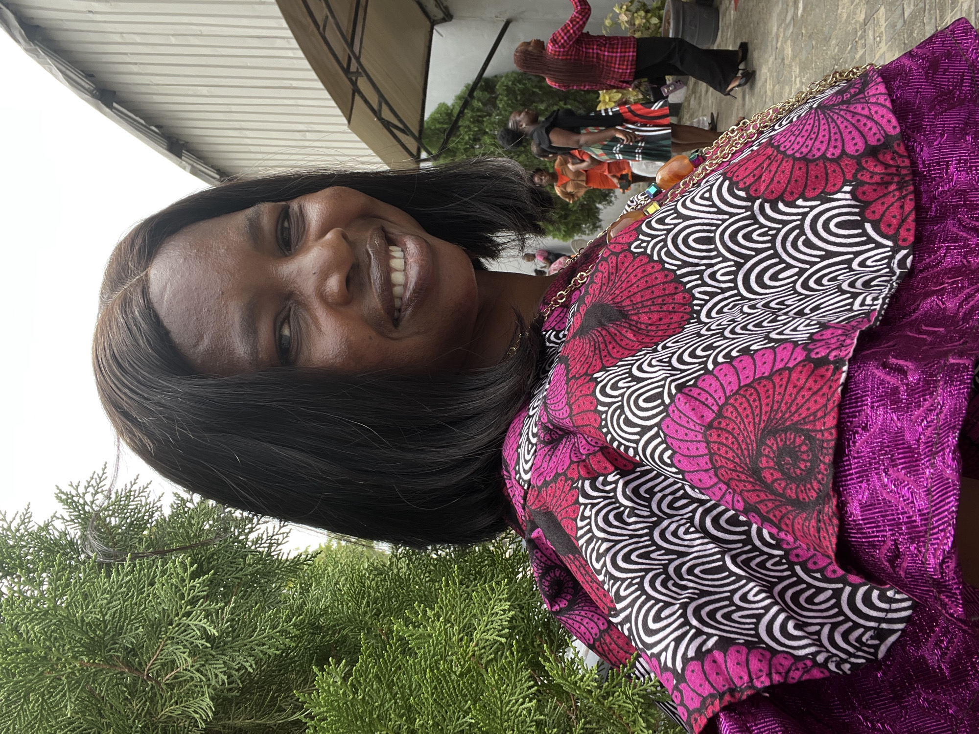 A smiling, dark-skinned woman with short, dark hair is the main subject, positioned in the foreground of the image. She is wearing a colorful patterned top with pink, black, and white designs over a shimmering purple garment. A gold-colored chain and beaded necklace are visible around her neck. Behind her, to the left, is a dense green bush. In the background, blurred figures of several people are visible; one is wearing a red plaid shirt and black pants, another an orange shirt, and others wear patterned dresses. A building is partially visible in the upper-left corner of the frame. This scene is likely located in the city of Ado, Nigeria, due to the subject's ethnicity and attire. Specific details to definitively determine this are missing.