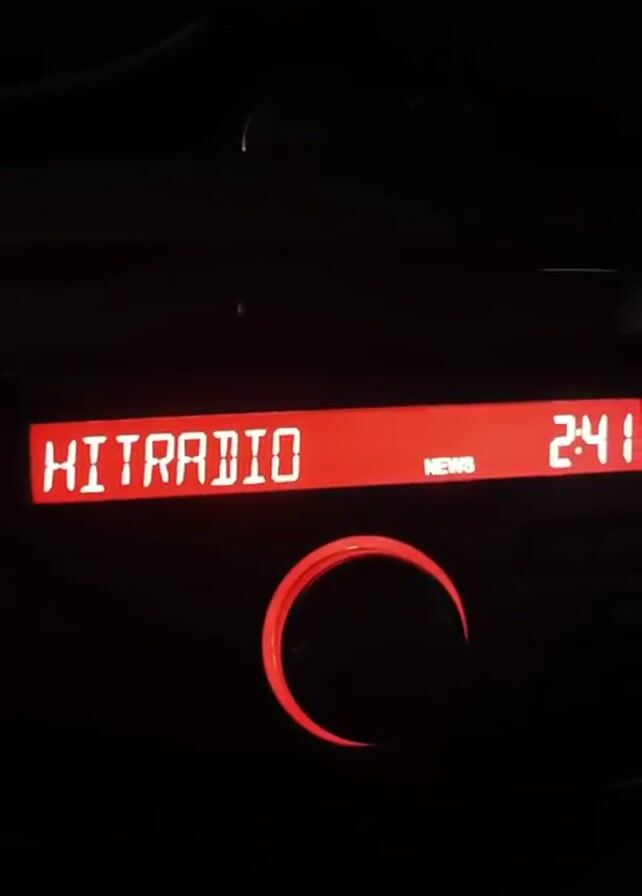 radio of a car playing music. The radio is set to "HITRADIO" and displays the number "241". A red circle is seen below the display. The surrounding area is dark. The camera moves slightly, showing more of the car's interior. The sound of music can be heard.