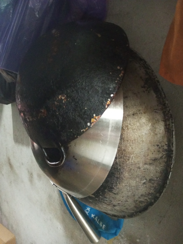 three stacked pans. The top pan is heavily used and blackened with cooking residue. A smaller, shiny stainless steel pan partially covers it. Beneath these two, a larger, tarnished pan is visible. All three pans are positioned on top of a blue bag with white lettering, partially obscuring it. Additional out-of-focus objects, including blue plastic and an orange garment, are present in the background.