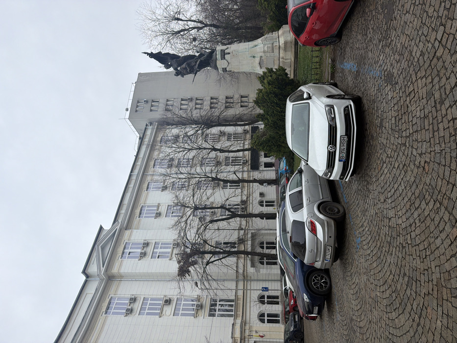 The scene depicts an urban outdoor area in Bucharest, Romania, situated in front of the Ministry of National Defense building on Strada Izvor, adjacent to the Monumentul Eroilor Patriei. The sky is overcast, indicating daytime conditions. In the foreground, a wet, circular pattern of cobblestone paving serves as a parking area. A white Volkswagen Jetta sedan (license plate B 314 HSH) is parked facing the viewer. Immediately to its left, a silver Opel Astra hatchback (license plate B 743 AMS) is parked perpendicular to the Jetta. A red vehicle is partially visible to the Jetta's right, also parked perpendicularly. Additional vehicles of various colors and models are parked further back. On the left, a large, multi-story building with a light-colored neoclassical facade is visible. It features numerous evenly spaced rectangular windows, multiple external air conditioning units, and a prominent pediment above its upper-middle section. A Romanian flag is displayed near the building's lower-left entrance. Behind and to the right of this classical structure, a taller, plainer grey building with visible windows and air conditioning units is partially obscured by trees. On the right side of the image, the Monumentul Eroilor Patriei stands, consisting of a bronze sculptural group depicting multiple figures, including soldiers with a flag, mounted on a tall, multi-tiered stone pedestal. Bare deciduous trees, green shrubs, and patches of grass surround the monument. No people are visible within the frame.
