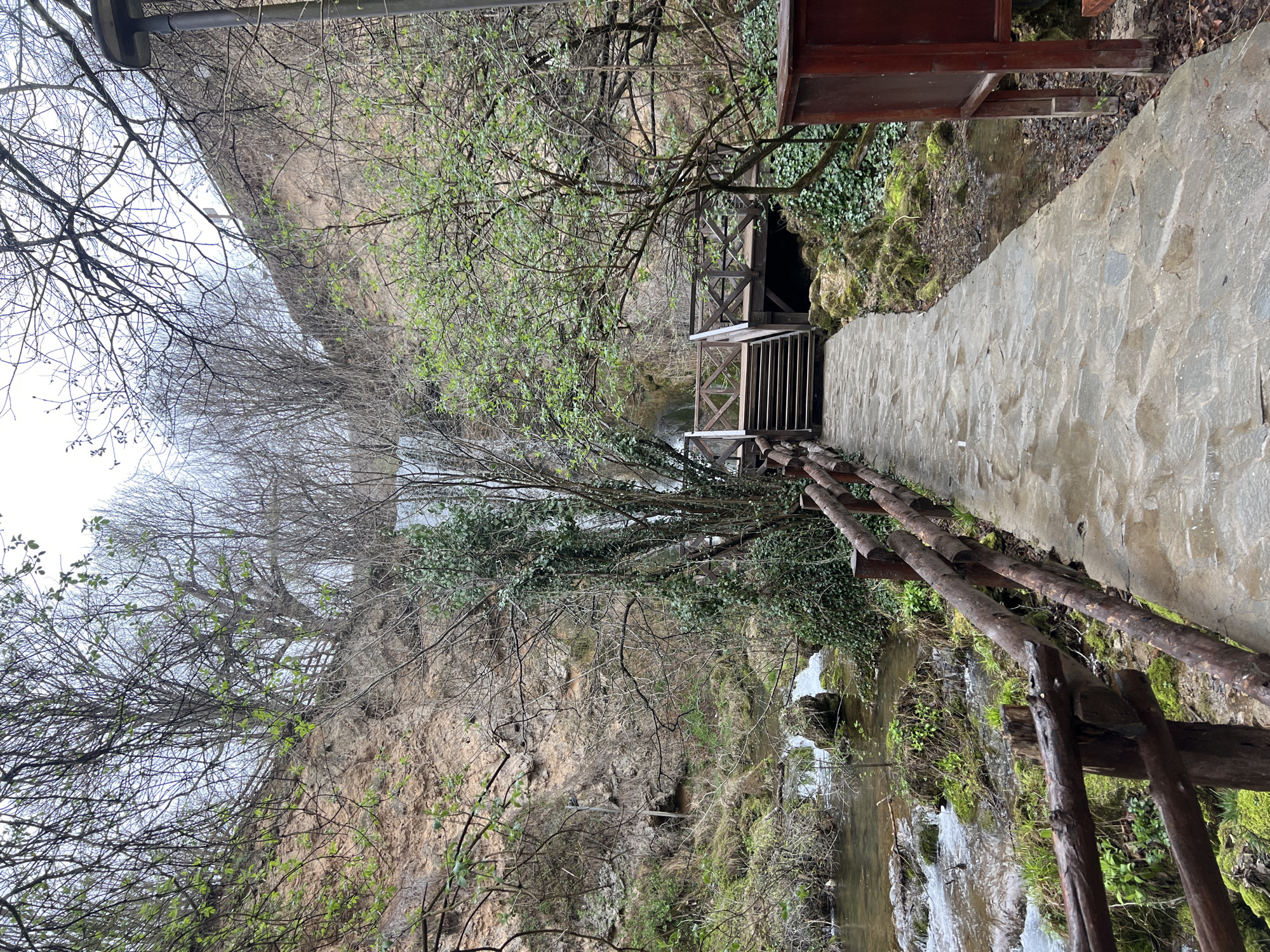 The image displays a natural landscape situated within Despotovac Municipality, Serbia, centered on a cascading waterfall and an accompanying stream. A winding pathway paved with irregular grey flagstones extends from the foreground into the midground. To the left of the pathway, a rustic fence constructed from horizontal logs borders a shallow, clear stream featuring visible water flow and minor rapids over moss-covered rocks. On the right, partially obscured by foliage, a dark red/brown wooden kiosk or sign structure is visible. In the midground, the pathway terminates at a multi-level wooden structure consisting of stairs and railings, forming a viewing platform or bridge that extends towards the base of the waterfall. The waterfall itself descends from a prominent, steep, reddish-brown earthen cliff face in the background. The surrounding environment is heavily vegetated with numerous trees and shrubs; many deciduous trees exhibit bare branches with nascent green leaves, indicative of early spring, while patches of evergreen ivy cover tree trunks and ground areas. The sky is overcast, presenting a uniform light grey tone. No individuals are present within the scene.