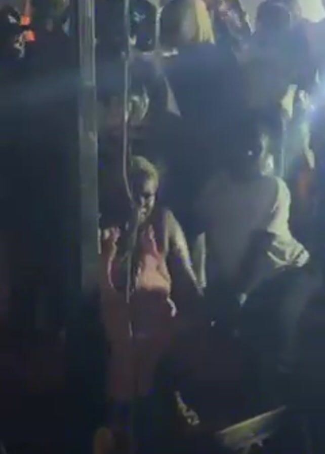 crowd of people dancing at a music event, possibly a rave or party. The lighting is dark, with blue and white strobing lights. A woman with short blonde hair is kneeling in the foreground, smiling, while others dance around her. There are wires and a metal pole near the camera, suggesting the view is from the side or behind a stage element. People are moving and enjoying the music.