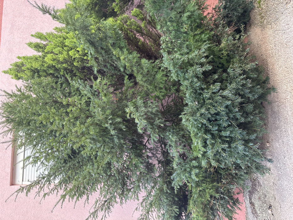 - "The image displays a large evergreen coniferous shrub or small tree situated directly against a light reddish-pink stucco-textured building wall in Kruče - Kërruçi, Montenegro" by FM-CAOHw1, licensed under CC BY 4.0