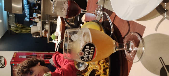 A table setting features a glass of "Estrella Galicia" beer and a glass of red wine. A plate sits above them. The beer glass is partially filled. Below, a pan contains food, possibly seafood-based. A child in a red shirt appears in the corner. The backdrop includes a refrigerator with "Estrella Galicia" branding and a glimpse of a bar-like setting with plants.