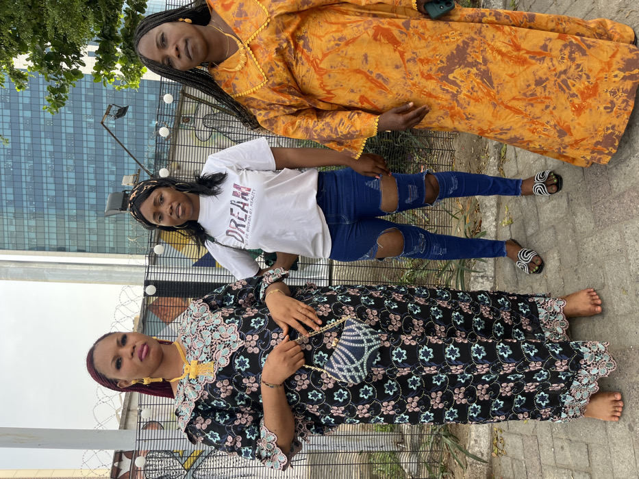 Three adult females stand outdoors on a paved surface in Itirin, Nigeria, facing the camera