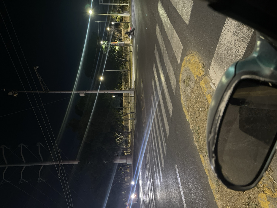 Night scene viewed from a car's side mirror. A crosswalk stretches across an empty road, illuminated by streetlights. On the left, power lines and poles recede into the darkness. Trees and possibly a sign line the road's edge. The side mirror dominates the right foreground, reflecting the darkness. The road is wet, reflecting the artificial light.