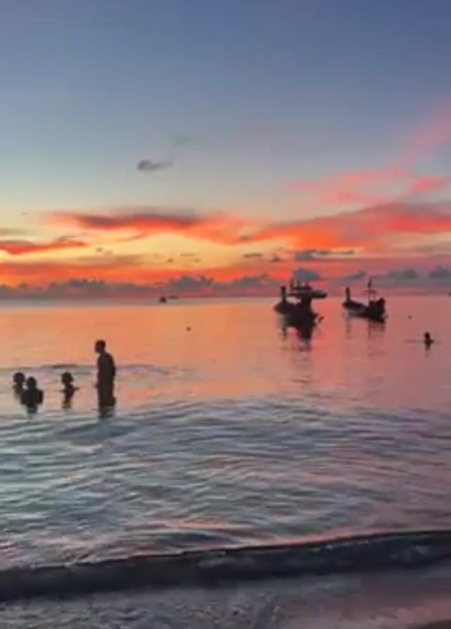 The scene features a vibrant sunset sky transitioning from blue at the top to orange and pink hues closer to the horizon. Several silhouettes of people are seen wading in the water near the beach, with others farther out. Two fishing boats bob gently on the sea. Small waves lap the shore in the foreground.