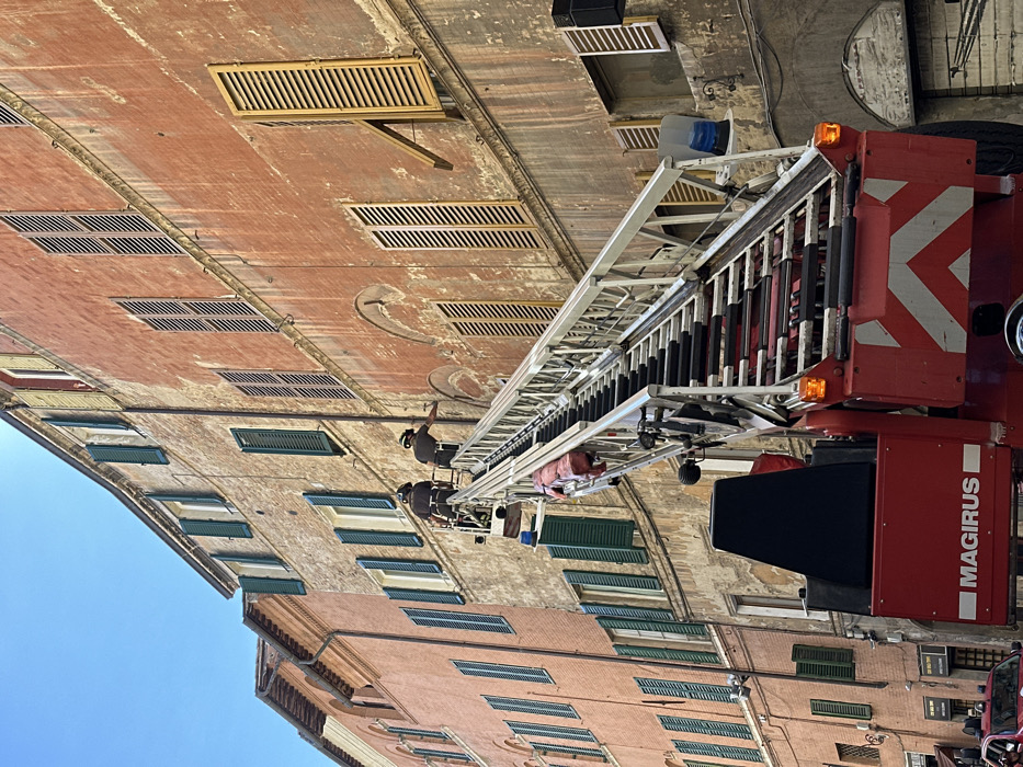 The image captures a daytime scene on a narrow, historic street in Siena, Italy. A red Magirus fire truck occupies the lower foreground, with its multi-section ladder extended at a steep angle, reaching the upper floors of an adjacent building. Two individuals, identifiable as firefighters by their dark uniforms and helmets, are positioned on the extended ladder. The higher firefighter is oriented towards the building's facade, while the lower one stands a few steps below. The primary building is a multi-story structure with a faded reddish-brown brick or stucco exterior, featuring numerous windows. Some windows have closed dark green shutters, others have closed light brown/yellow shutters, and one light brown/yellow shutter on an upper floor is visibly broken and hanging partially open. To the left, a second, lighter reddish-brown building with green shutters extends further down the street. The sky above is clear and blue. The scene indicates a maintenance or recovery operation by the fire department on a building within an urban environment.