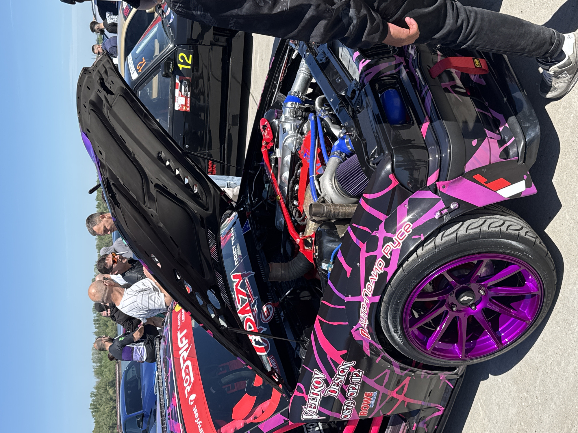 The image captures a close-up view of a modified car at an event, possibly a car show or race, in Ruse, Bulgaria. The car, with its hood open, showcases a complex engine setup with various colorful hoses and components. The exterior features a black and pink camouflage-like design, with sponsor logos like "Velikov Design" and "Rowe Motor Oil" prominently displayed. A purple wheel is visible, adding to the car's vibrant aesthetic. Several people, including men, are gathered around, peering into the engine compartment and observing the vehicle. The presence of the logos "nyfest," "DRIFT," and "BLITZI WOT" further suggests a motorsports or tuning-related event. The background reveals additional cars and a clear blue sky.