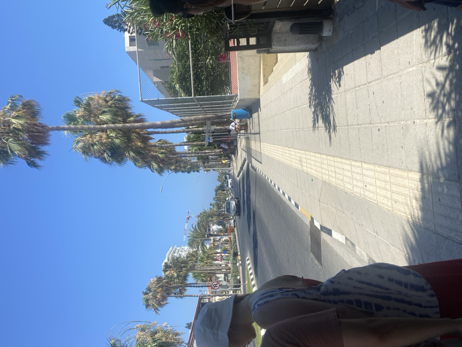 The image depicts a sunlit street scene on Poseidonos Avenue, Kato Paphos, within Paphos Municipality, Cyprus. The environment is clear and bright under a light blue sky, indicating fair weather conditions. In the immediate foreground on the left, three individuals are partially visible. The leftmost person's right arm and shoulder, covered by a brown fabric, are present. Immediately to their right, a person wearing a white bucket hat, a red or orange garment, and carrying a blue and white tie-dye tote bag is seen from the back, facing away from the viewer. On the far right foreground, only the right side of a person's head, featuring dark hair and the frame of sunglasses, is visible, suggesting they are facing right. The scene is dominated by a wide, two-lane asphalt road extending into the distance. The road's edges are delineated by white and black striped curb markings. Several vehicles are present on the road, including a silver sedan in the mid-ground and a white van further down. The road is flanked on both sides by rows of tall palm trees. On the left side of the road, a circular red and white road sign, possibly indicating a traffic restriction, is visible. On the right side of the image, a grey paved sidewalk features a tactile walking surface of yellow ridged blocks. Further along the sidewalk, a group of individuals is seated at a bus stop, next to which a blue cylindrical trash receptacle is located. Adjacent to the bus stop, a tall chain-link fence separates the sidewalk from an internal area, consistent with a sports court, beyond which green foliage and parts of a building are visible. In the background, multi-story buildings, including a prominent white structure with visible balconies, line the street. A construction crane is observable behind one of these buildings in the distance. Shadows from the palm trees are cast across the sidewalk in the foreground.