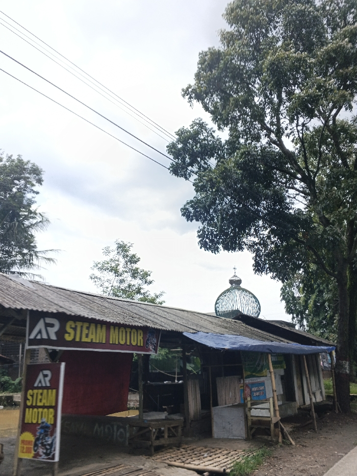 A roadside shop with a corrugated metal roof displays a sign reading "AR Steam Motor." Behind the shop, a green dome structure rises, possibly a mosque or other religious building. Lush green trees fill the right side of the frame and peek from behind the shop. Power lines stretch across the sky, partially obscured by a cloudy sky. The scene suggests a rural or semi-rural location.