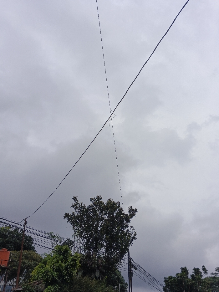The image depicts an outdoor scene under a heavily overcast, grey sky. Two prominent dark electrical or communication cables intersect in the upper-center, forming an 'X' shape. One cable runs diagonally from the lower-left to the upper-right, while the other runs mostly vertically downwards from the top edge, intersecting the first. Below these, a dense canopy of dark green foliage from a large tree occupies the central-lower third of the frame. Additional green vegetation and tree branches are visible along the lower-left and lower-right edges. In the lower-left quadrant, partially obscured by foliage, an orange cylindrical object, possibly a water tank, is visible, alongside utility poles supporting additional parallel cables running horizontally and diagonally. No people, animals, or vehicles are present. The scene is located in Шчыткавіцкі сельскі Савет, Belarus.