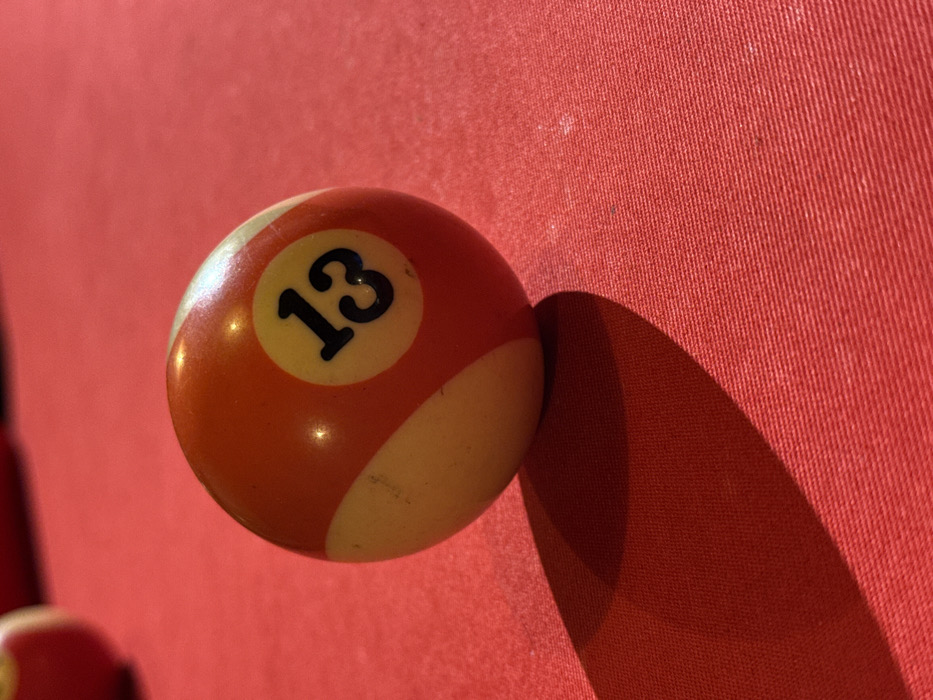 - "A red and white striped pool ball, numbered 13 in black text within a white circle, rests on a red felt billiard table" by FM-8JC2m2, licensed under CC BY 4.0