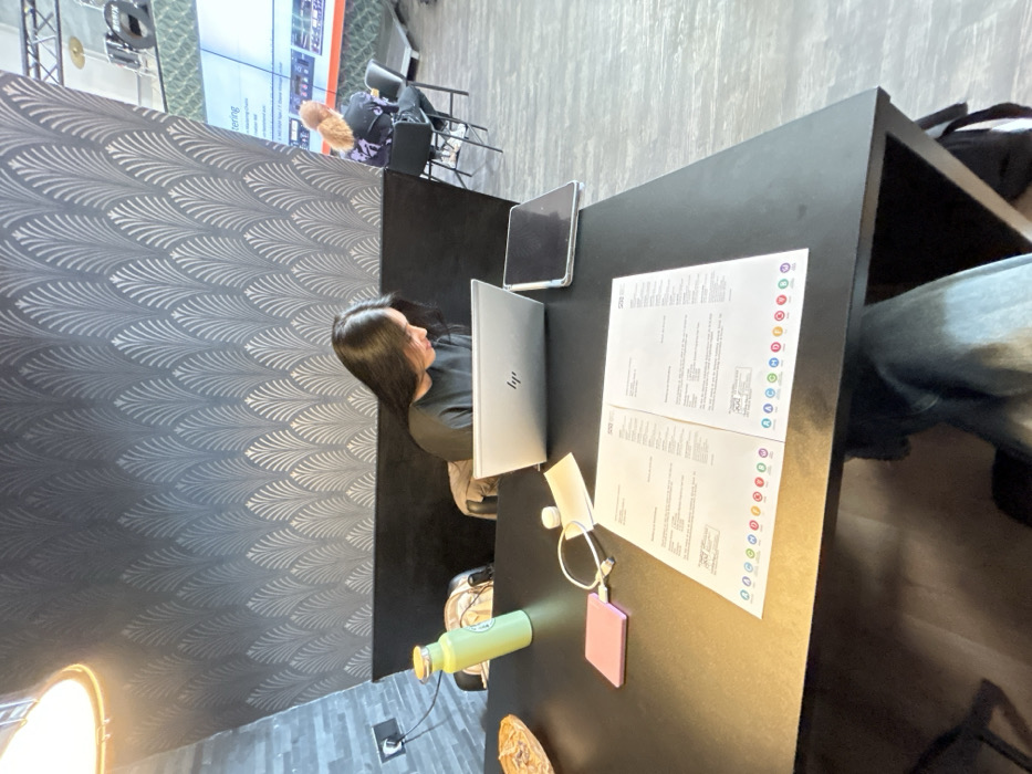 The scene is an interior view of a modern event or co-working space located in Bochum, Germany. In the midground, a person with long, dark hair, wearing a dark long-sleeved top, is seated on a dark upholstered bench at a black rectangular table, looking downwards at a silver HP laptop. A beige garment is draped over the back of their seat. To the left of the laptop, a light green water bottle with a wooden cap is positioned on the table. A closed dark-colored tablet in a translucent case rests to the right of the laptop. On the table in the immediate foreground, two white sheets of paper featuring printed text and colorful circular icons are laid open side-by-side. Adjacent to these papers are a small, flat pink rectangular device (possibly a power bank) and a coiled white USB cable. A brown, textured, bowl-shaped item is present on the far left edge of the table. The background features a dark gray wall patterned with repeating light gray fan-like motifs. To the left, a section of wall with dark horizontal tiling is visible, containing a white power outlet. In the right background, two additional individuals are seated at high tables, facing a large screen displaying a presentation or data with text and graphics. One person, seen from behind, has light curly hair and wears a dark patterned hoodie. Musical drum equipment, including cymbals and a drum with a "BASIX" or "BOSS" logo, is visible on an elevated platform or stage behind these individuals. Metal trussing is present above the stage area. The floor is light gray with a linear patterned tile design. An overhead light fixture emits a warm glow from the upper left.