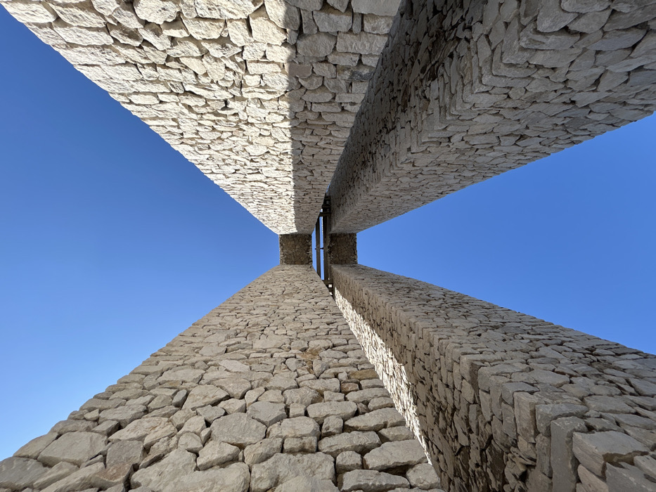 The image displays a worm's-eye view of a segment of a monumental stone structure located in Perushtitsa, Bulgaria. Four primary architectural elements are visible, constructed from light-colored, rough-cut stone units, consistent with gabion or dry-stacked masonry. Two large, vertical, rectangular pillars ascend from the lower frame, converging slightly towards the top. Above these, two horizontal stone sections connect the upper portions of the pillars, forming a bridge-like structure with a visible underside. Strong shadows are cast on the left faces and undersides of the stone elements, indicating direct sunlight from the upper right. The background is a clear, deep blue sky, visible through the central opening formed by the structures and above them. No human figures or discernible activities are present.