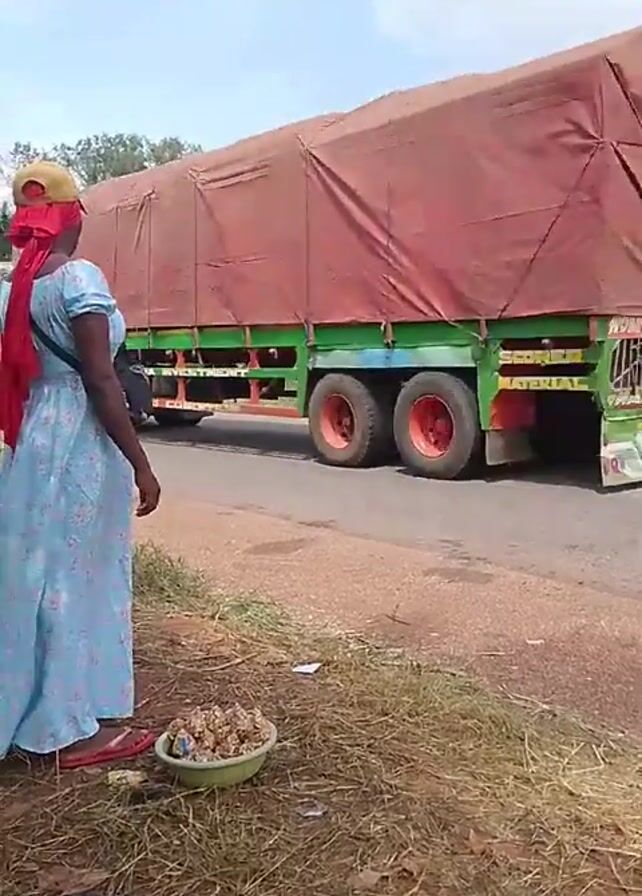 A person standing beside a road with a bowl of food and a water jug observes a large truck driving away