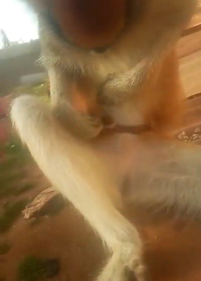 monkey sitting on a corrugated surface. The monkey has brownish-gray fur and a reddish-brown patch on its head. At first, the monkey is grooming itself, then it looks directly at the camera. The background shows a brick wall and a clear blue sky. A person can be seen in the background briefly. The video is filmed with a Tecno Camon 17 phone.