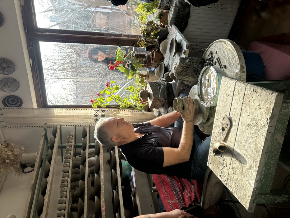 An interior view of a pottery workshop in Horezu, Romania, features an adult male actively engaged in crafting ceramics