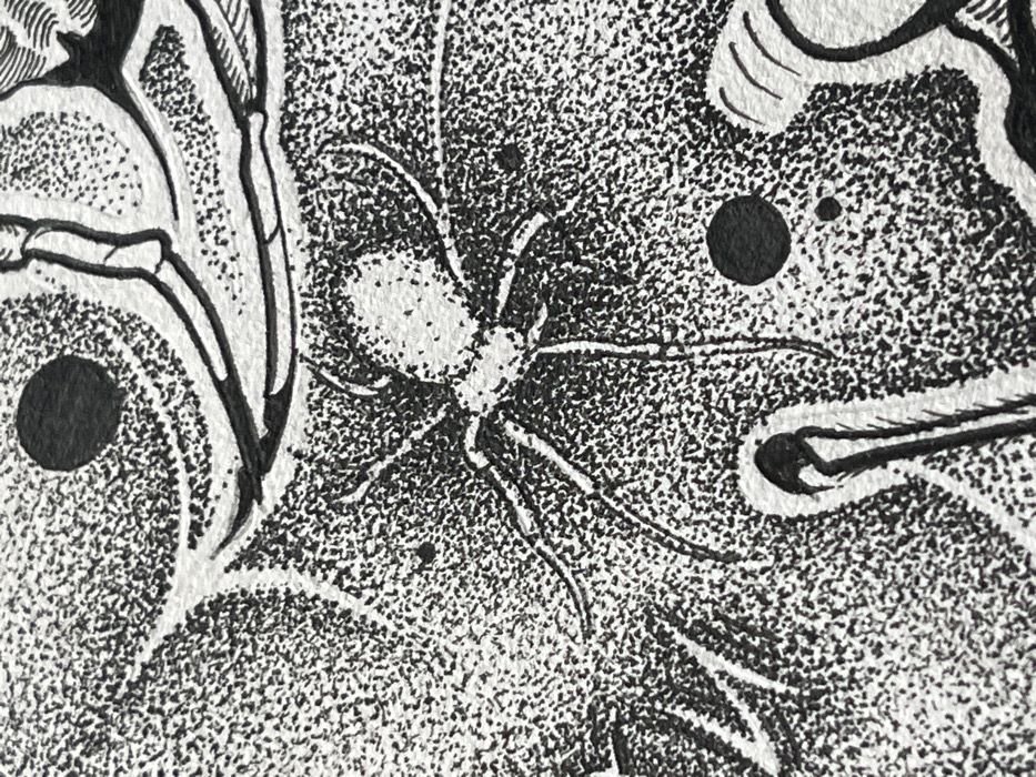 An ink illustration, observed in Aksay, Russia, depicts a black and white arachnid-like creature centered on a stippled background