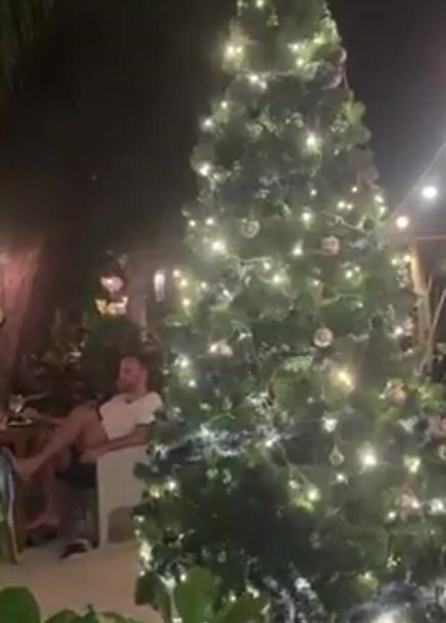 n outdoor nighttime scene, likely a restaurant or lounge area, decorated for Christmas. In the initial shot, a brightly lit Christmas tree adorned with ornaments and a star stands prominently in the foreground. Several people are seated at tables in the background, illuminated by string lights. The surrounding area is decorated with tropical plants. As the camera pans, it reveals more of the outdoor dining space with patrons sitting at tables. The camera eventually focuses on a small stage where a man plays the guitar and a woman sings. They appear to be providing live entertainment for the guests. The atmosphere is relaxed and festive.