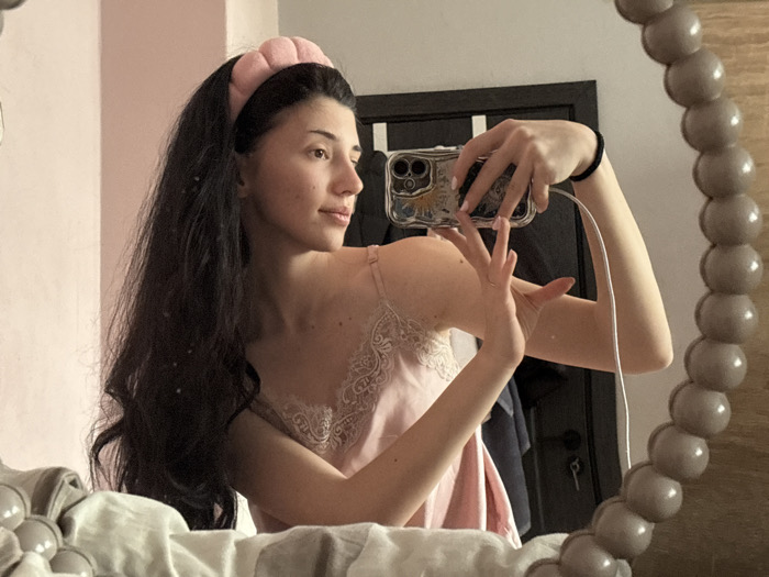 - "A young woman is depicted in a mirror selfie, showing her upper body in profile, facing right" by FM-k8XGj2, licensed under CC BY 4.0