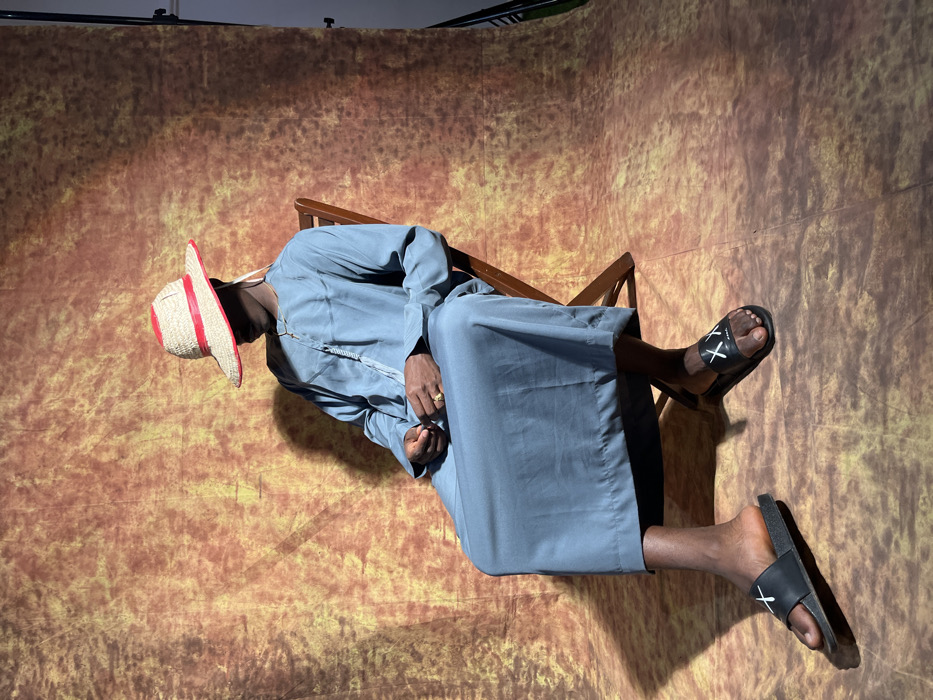 An individual is depicted seated in what appears to be a photography studio, located in Barakin Akawo, Nigeria. The subject, an adult with dark skin, wears a long-sleeved, slate blue kaftan-style garment. A wide-brimmed straw hat with a red band and red trim conceals the face; a light-colored ribbon hangs from the hat's rear. On the feet are black slip-on sandals featuring a white 'X' graphic and 'KAWS' branding. The individual wears a gold-colored ring on the right ring finger and a thin gold-colored chain with a small pendant around the neck. The subject is positioned on a dark brown wooden folding chair, with legs slightly apart and the left foot extended forward. The background consists of a textured fabric backdrop in mottled shades of brown, orange, and yellow, extending from the wall to the floor. Partial studio lighting equipment is visible on the right side of the frame.