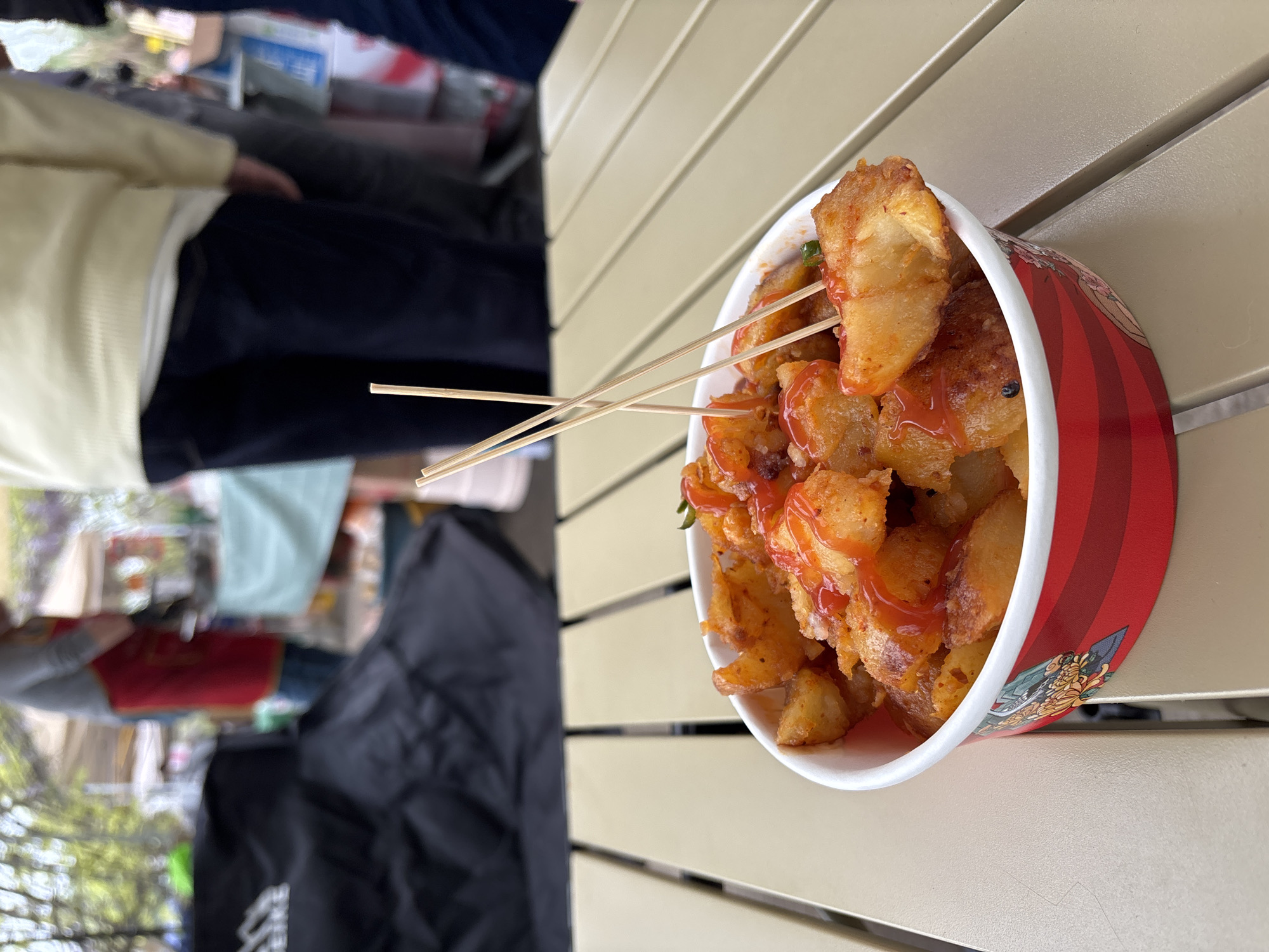 paper cup filled with fried potatoes topped with red sauce, possibly ketchup, with three wooden skewers sticking out. The cup has red and white stripes and a cartoon image on the side. The cup sits on a table with light beige planks. In the background, blurred figures suggest a gathering of people. The presence of black clothing, perhaps a bag or jacket, is also visible. This scene likely takes place outdoors. While the prompt suggests Xianfeng, China, this cannot be confirmed based on the image alone.